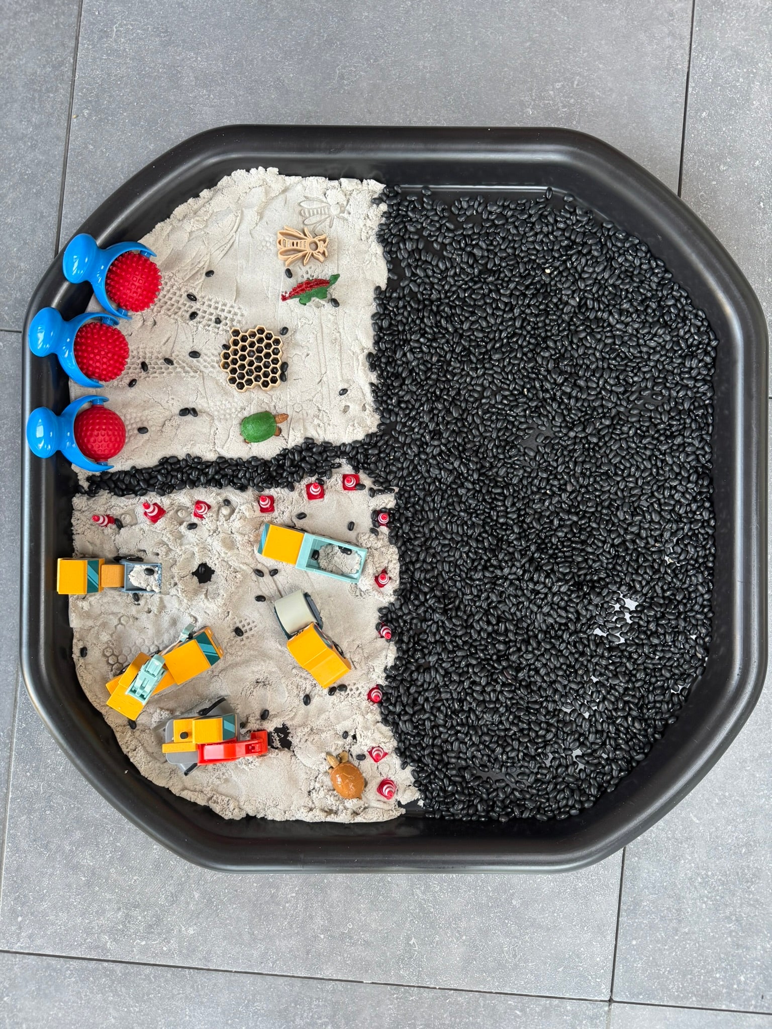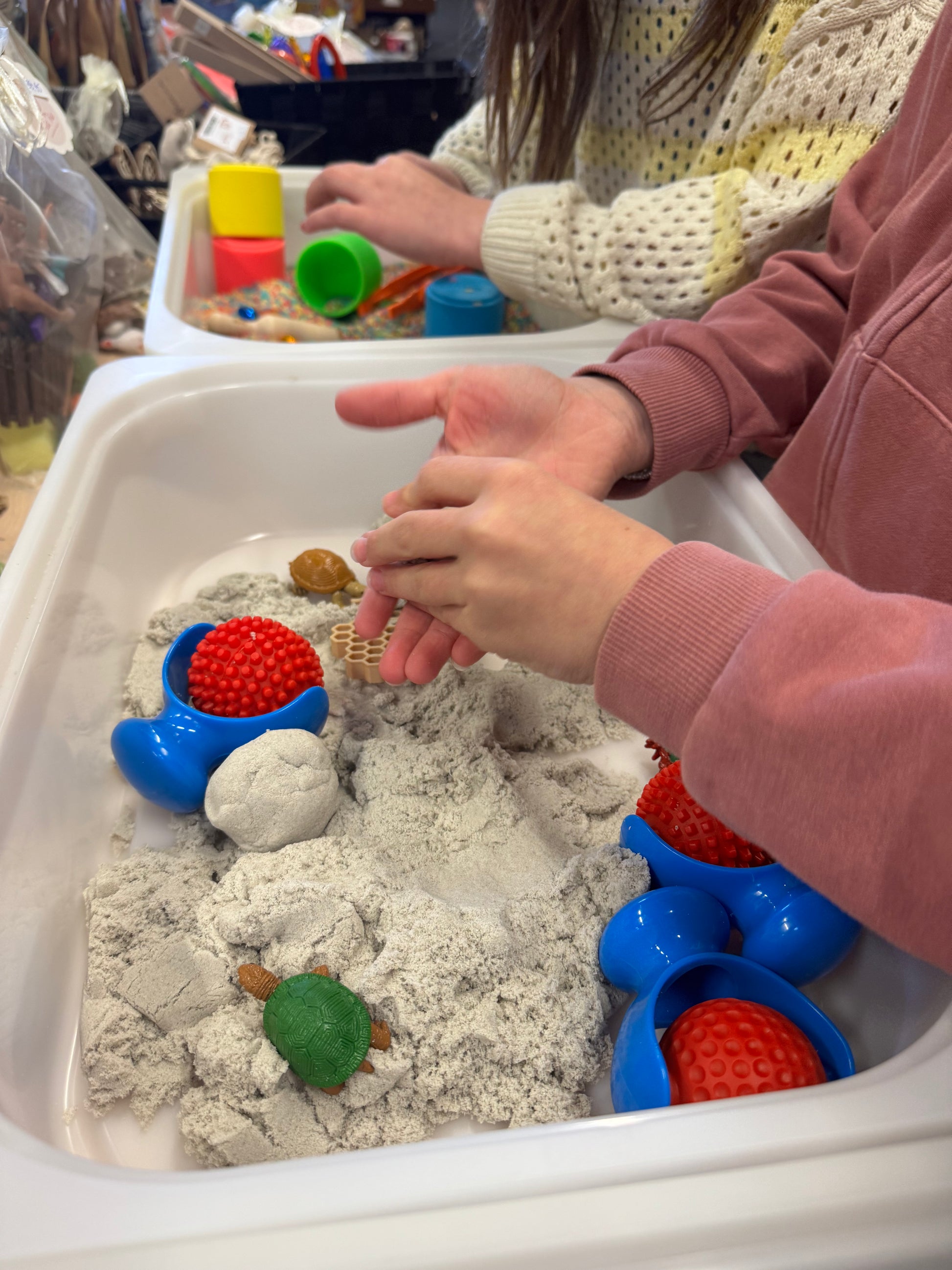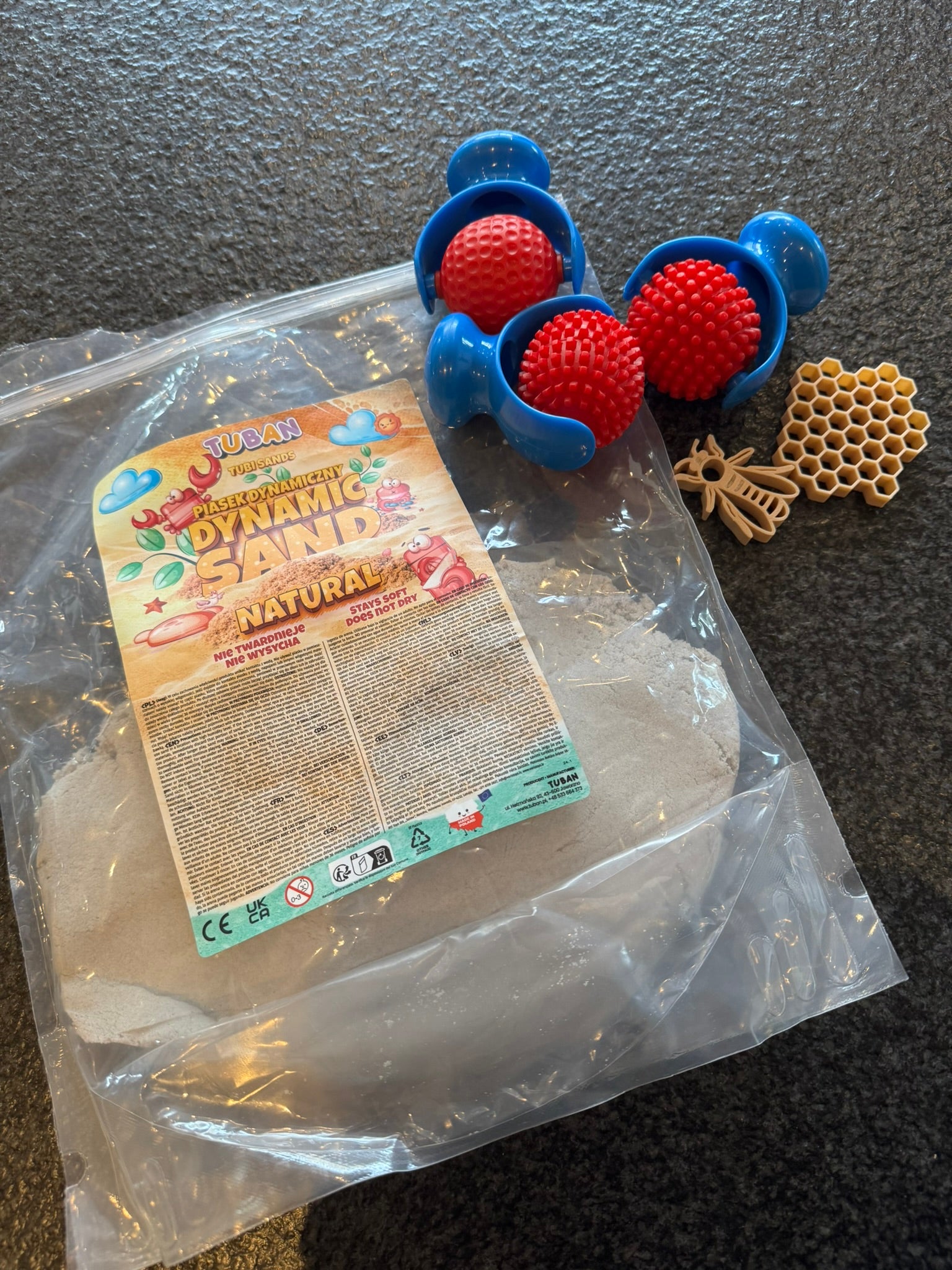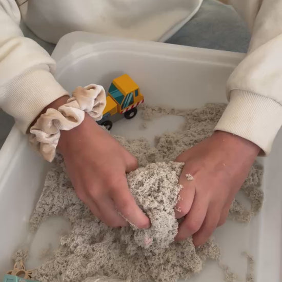 Deze tweedekans set met dynamisch zand en tools werd eerder gebruikt tijdens speelsessies, maar is nog in prima staat om opnieuw ontdekt te worden.