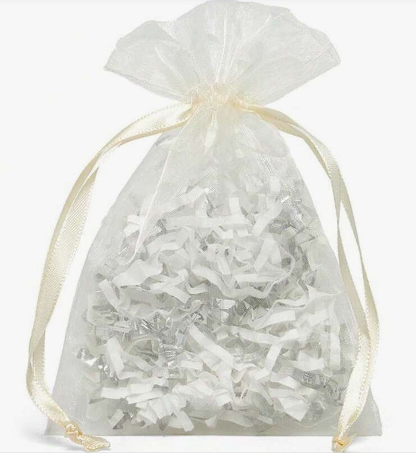 Set van 21 nieuwe premium organza zakjes in ivoorkleur, perfect voor snoepjes, juwelen of kleine cadeautjes. Gemaakt van doorschijnende mesh nylon met trekkoordsluiting.